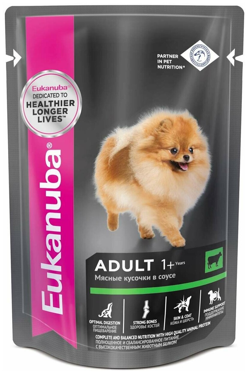 Влажный корм для собак Eukanuba Adult 1+ years, для здоровья кожи и шерсти, c говядиной, 100 г (кусочки в соусе)