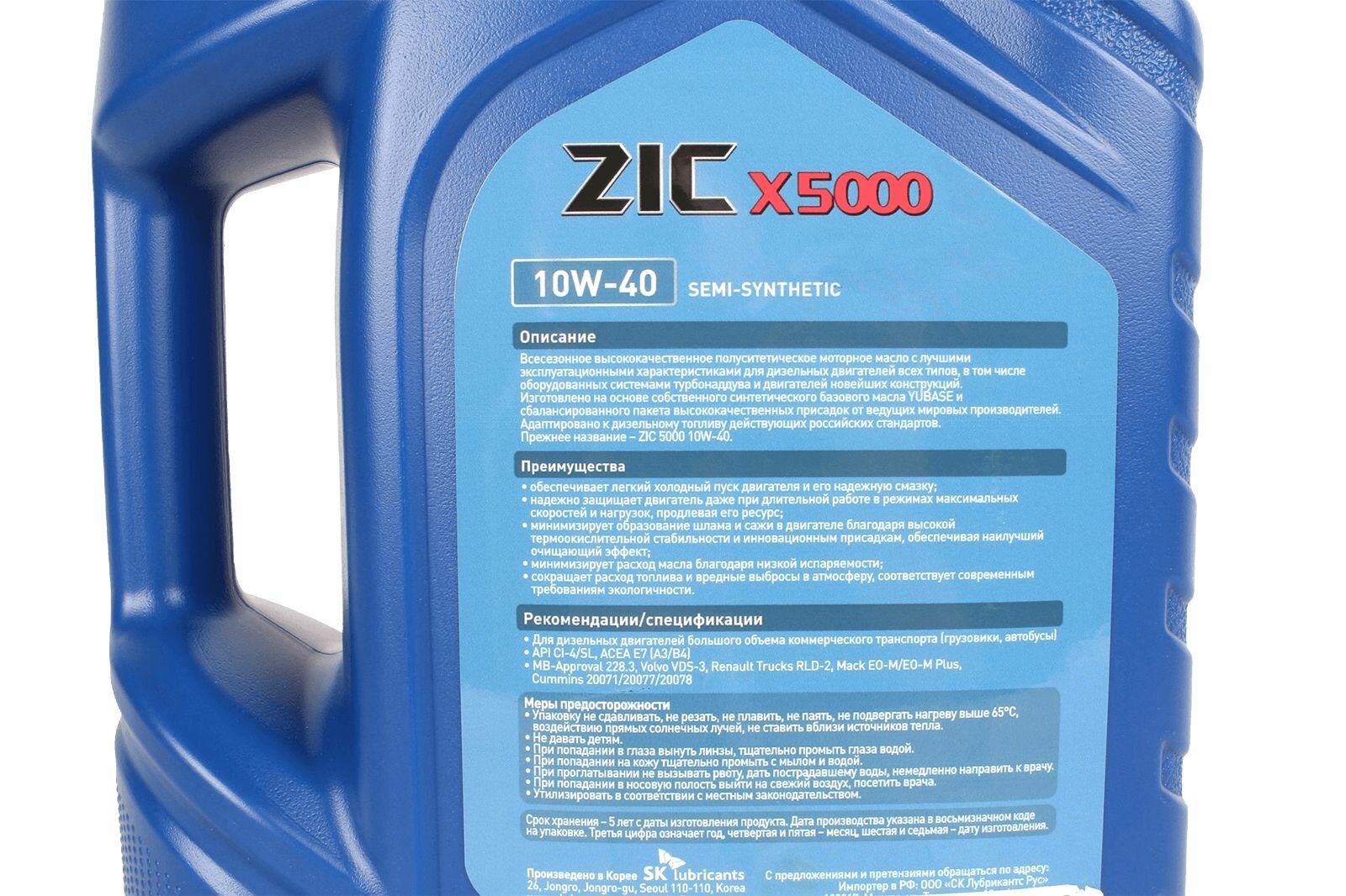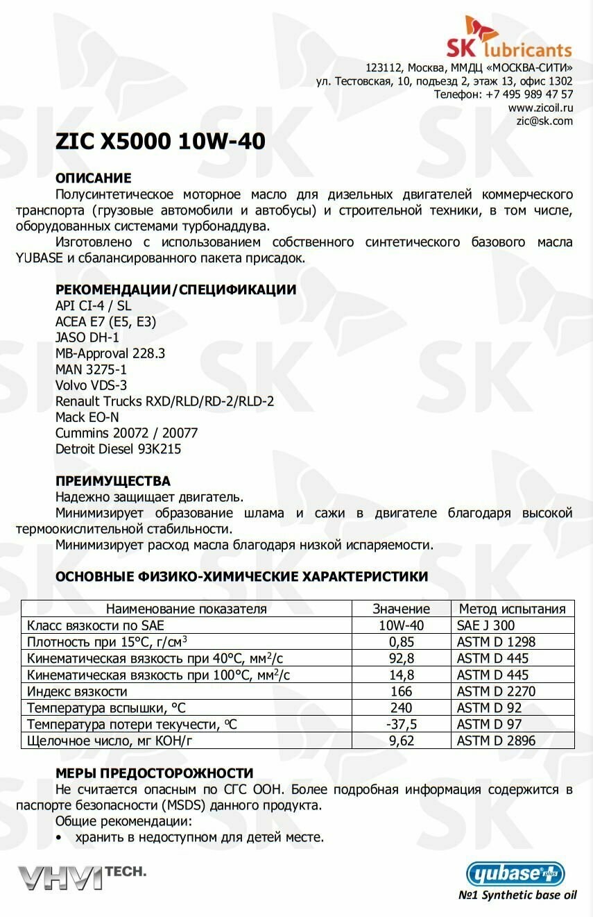 ZIC 162658 Масло моторное полусинтетическое 4л - ZIC X5000 10W-40, API CI-4/SL, ACEA E7 (E5, E3), JASO DH-1, MB 228.3, Volvo VDS-3, MAN 3275-1