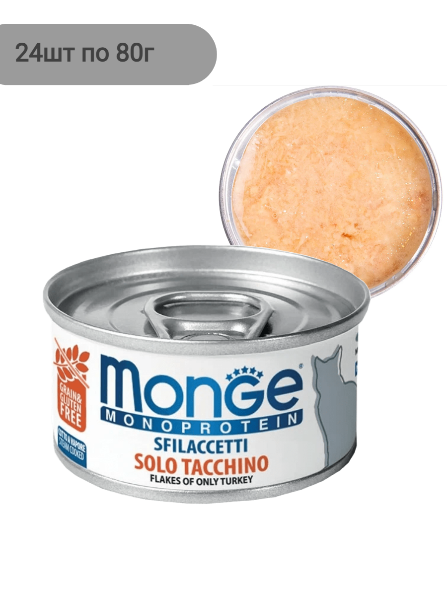 Купить Влажный корм для кошек Monge Cat Monoprotein, мясные хлопья из индейки, консервы 24 шт по 80 г