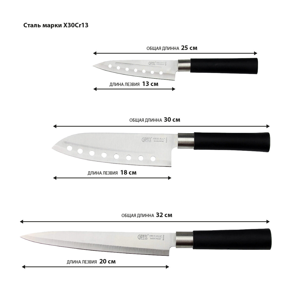 | Типы ножей в наборе | нож сантоку, разделочный нож, универсальный нож |
