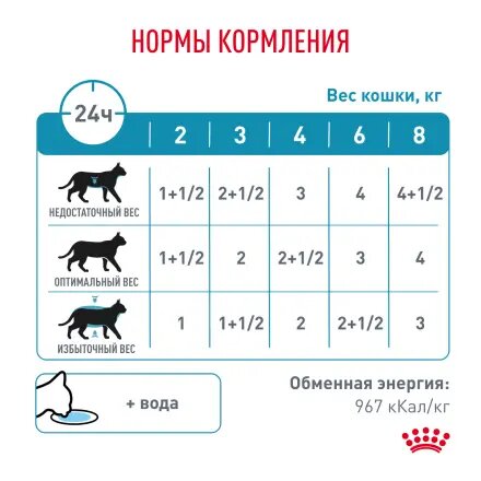 | Дозировка | см. таблицу. Корм готов к употреблению. Проследите, чтобы у вашей кошки всегда была свежая вода. Номер серии, регистрационный номер завода-изготовителя и срок годности указаны на упаковке. |