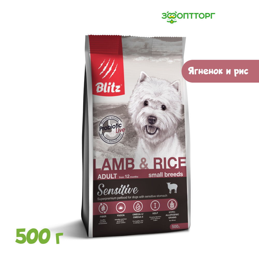 Сухой корм Blitz для собак мелких пород с чувствительным пищеварением ягненок и рис sensitive lamb & rice adult dog small breeds 500г 680627