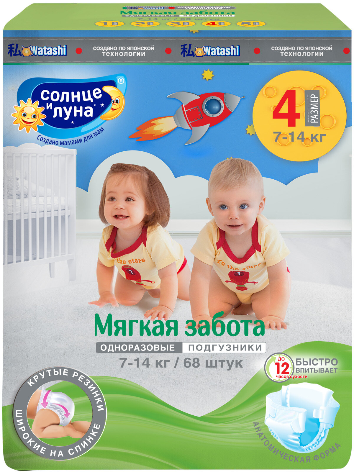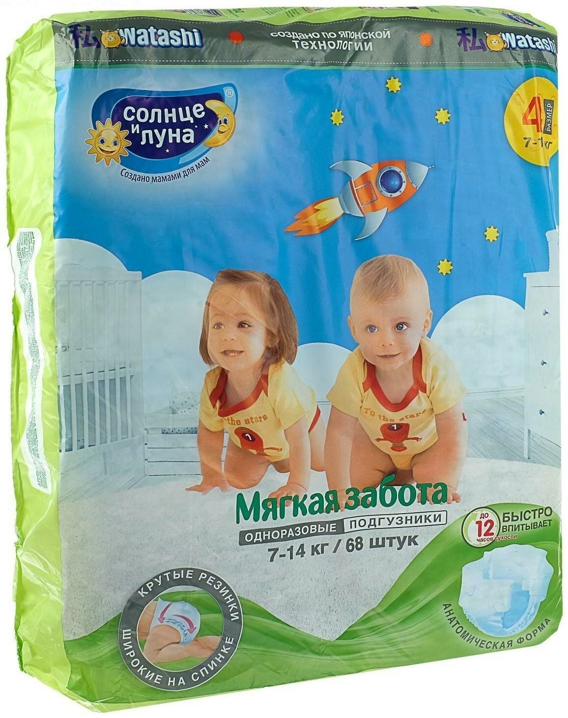 Купить Подгузники одноразовые для детей 4/L 7-14 кг mega-pack 68шт солнце И луна мягкая забота