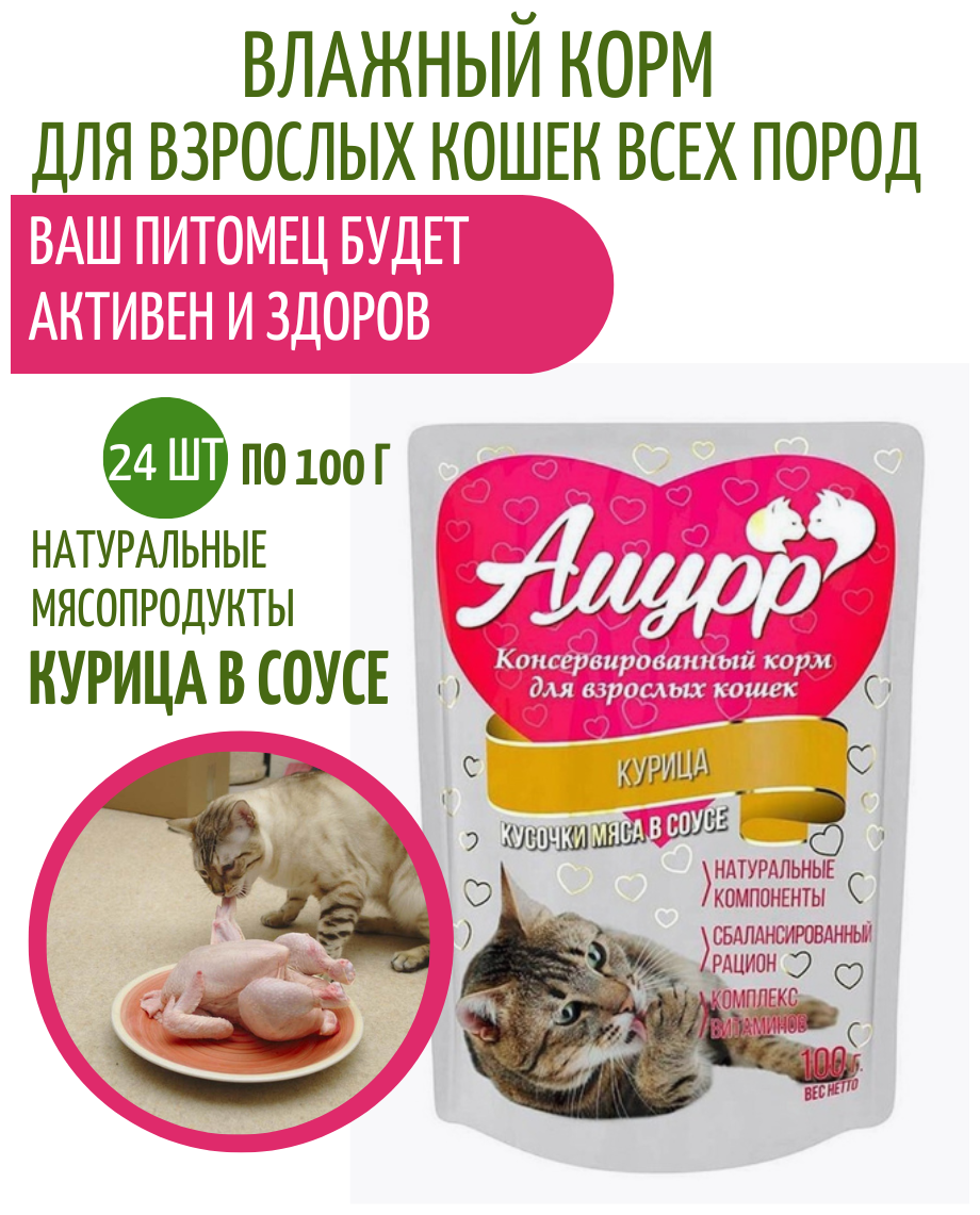 Купить Корм для кошек влажный Амурр, полнорационный Курица в соусе 100 гр 24 шт