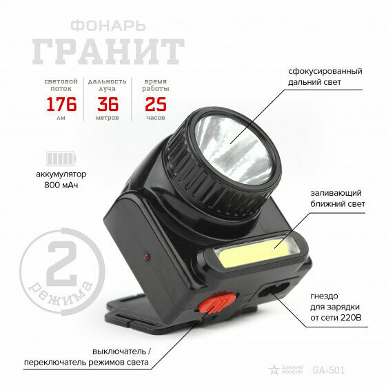 GA-501 Фонари АР армия россии налобный Гранит [3Вт COB + 3Вт LED, ближ и дальн свет, аккум, карт] (3