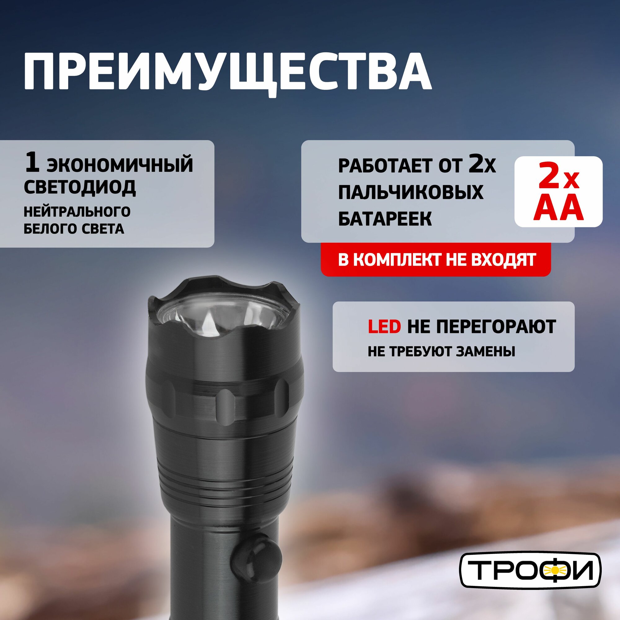 Трофи Светодиодный фонарь ручной TM1W на батарейках 1x1W LED ударопрочный алюминий 2хАА, Б0023319