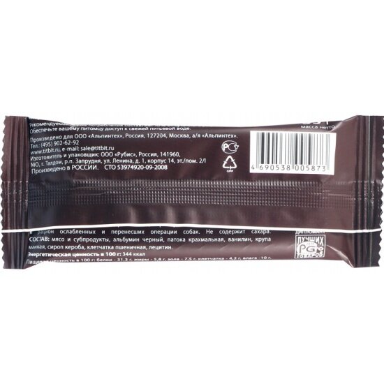 | Состав | мясо и субпродукты, альбумин черный, патока крахмальная, ванилин, крупа манная, сироп кероба, клетчатка пшеничная, лецитин |
