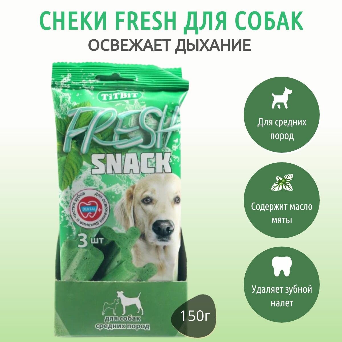 TiTBiT Fresh 1шт - 150г лакомство снеки с мятой и хлорофиллом для собак средних пород