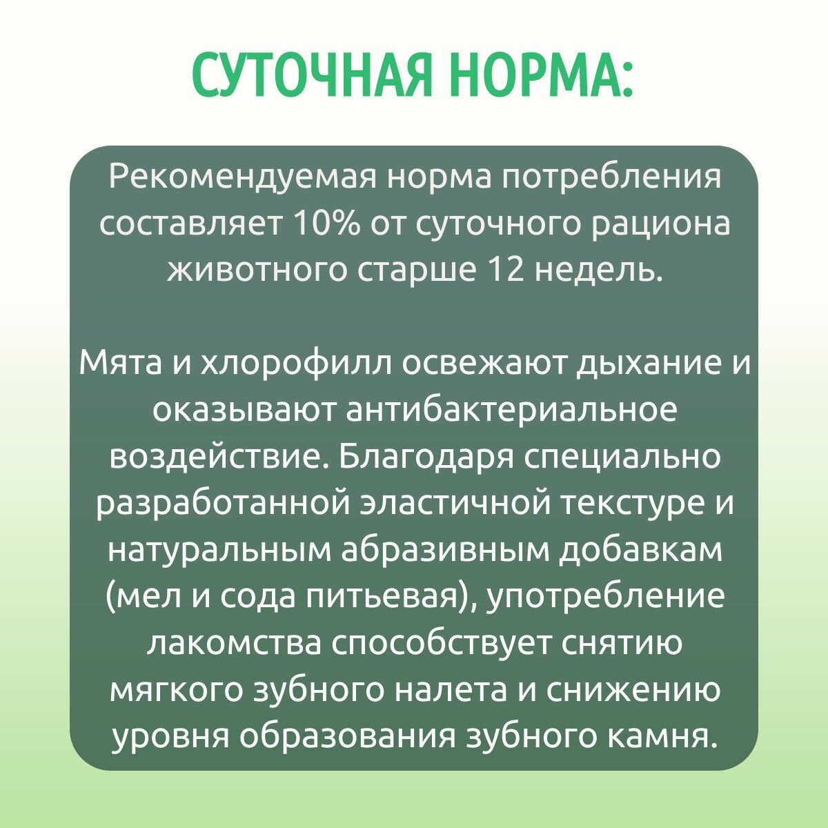 | Состав | рис, мясо и мясные субпродукты, карбонат кальция (мел), гидрокарбонат натрия (сода питьевая), мята, чабрец, петрушка, клетчатка, лецитин, минеральный комплекс, хлорофилл, натуральный ароматизатор (масло мяты), витамины: А, В6, D3 |