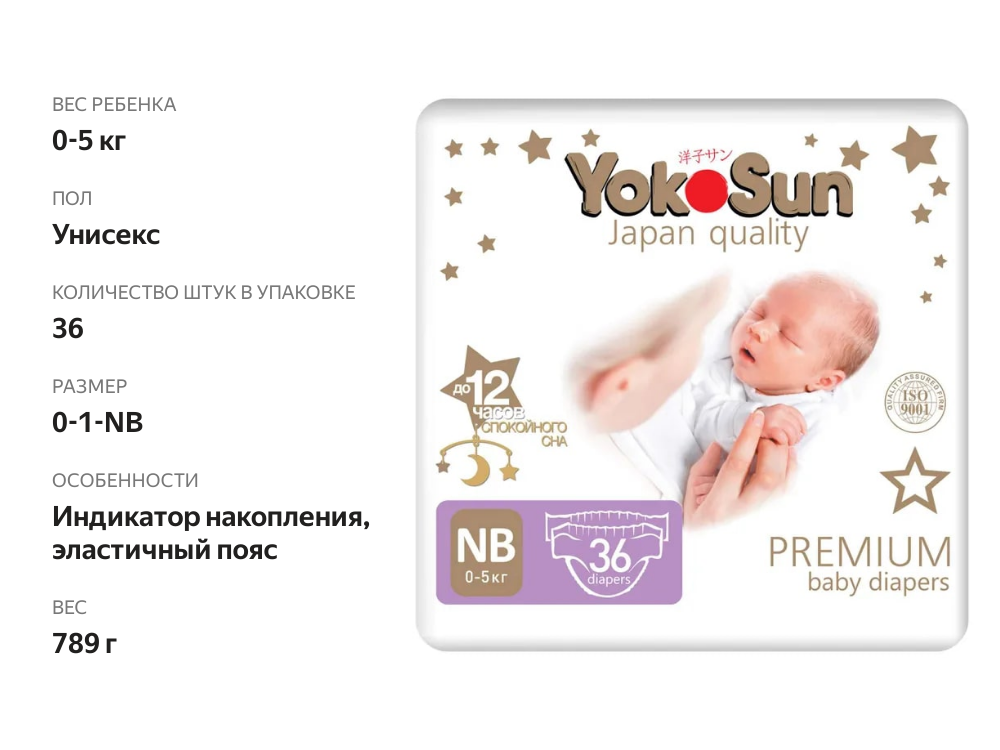 Подгузники для новорожденных YokoSun Premium на липучках, размер 1/NB (0-5 кг), 36 шт. интересное:
