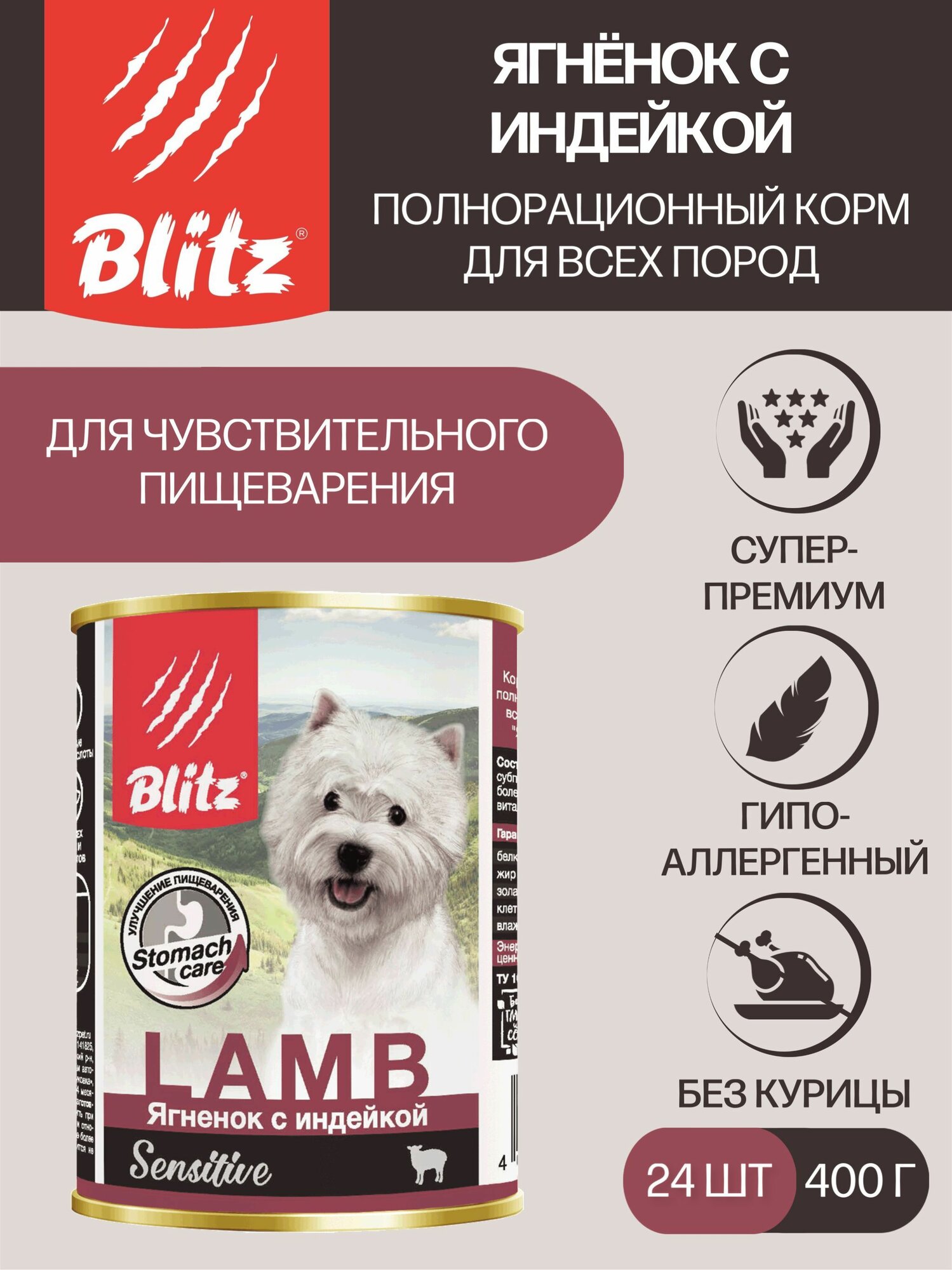 Купить Blitz Sensitive Adult Dog влажный корм для взрослых собак с чувствительным пищеварением, с ягненком и индейкой, в консервах - 400 г х 24 шт