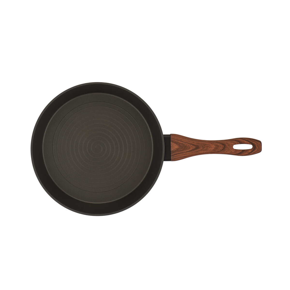 | Плюсы: | Толстые стенки, антипригарное покрытие, оригинальный узор на дне, хорошо держит тепло, ручка из пластика с узором под дерево. |
