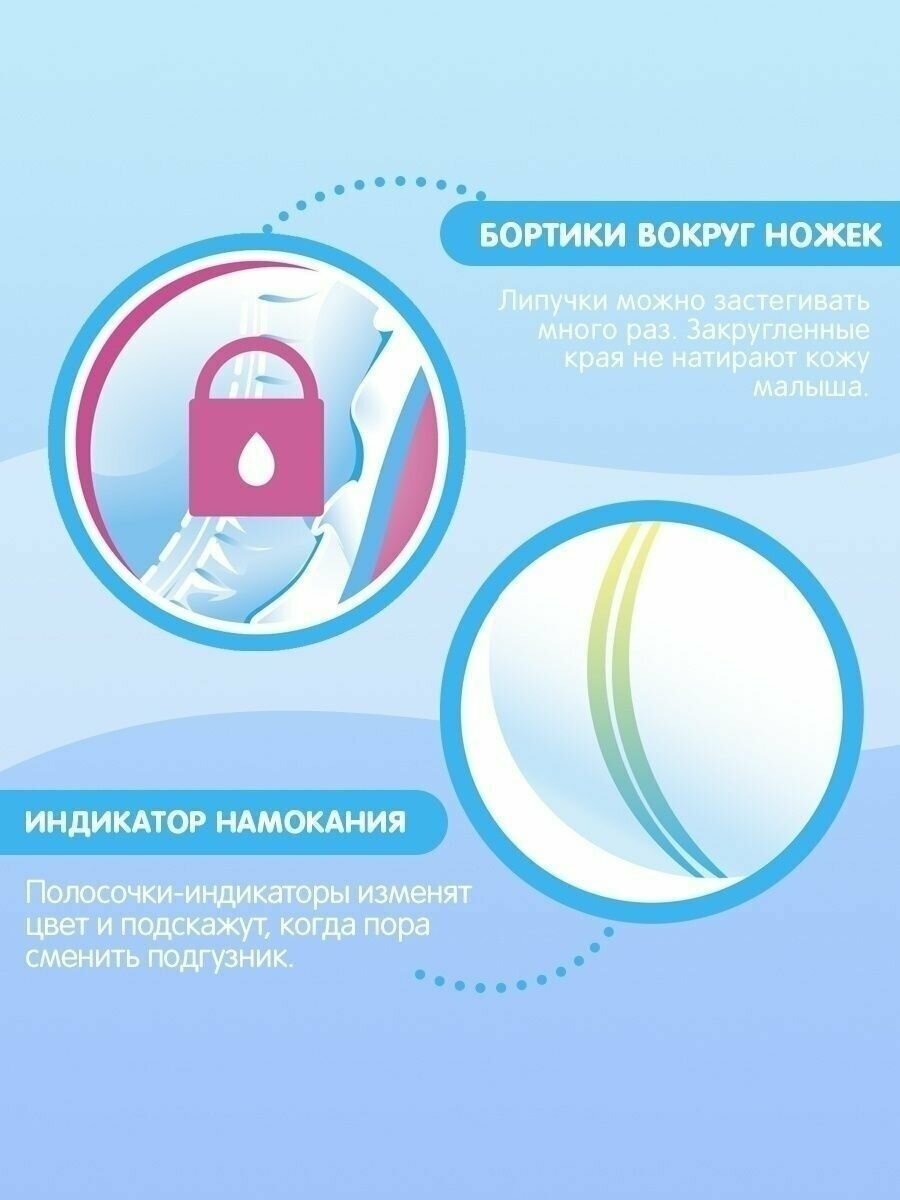 | Дополнительная информация | инструкция по применению:развернуть подгузник и подложить повыше под спинку ребенка, плотно натянуть спереди и застегнуть липучки, расправить складки внутреннего слоя вокруг бёдер, складки плотно и без зазоров должны прилегать к телу, проверить плотность прилегания подгузника к телу ребенка, между подгузником и животиком малыша должен оставаться промежуток в один палец; необходимо перейти на другой размер если подгузник стал тугим вокруг ножек или живота, увеличился объем мочи, не хватает длины подгузника - пупок выглядывает из под подгузника, липучка застегивается в самом крайнем положении |