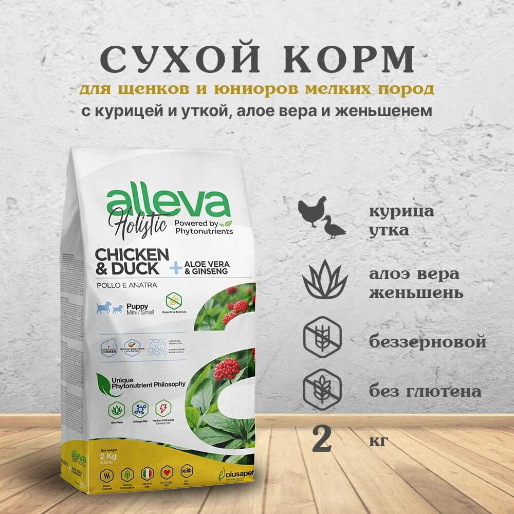 Сухой корм для щенков мелких пород Alleva Holistic, беззерновой, курица с уткой, алоэ вера и женьшенем, для беременных и кормящих, 2 кг