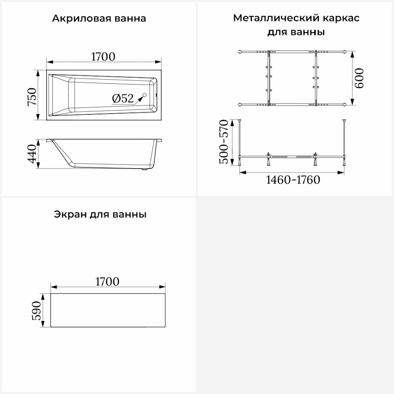 Акриловая ванна 170x75 с каркасом и экраном Lavinia Boho Pure S2-3710075P в наборе 4 в 1: прямоугольная ванна 170 x 75 см, каркас, экран, подголовник