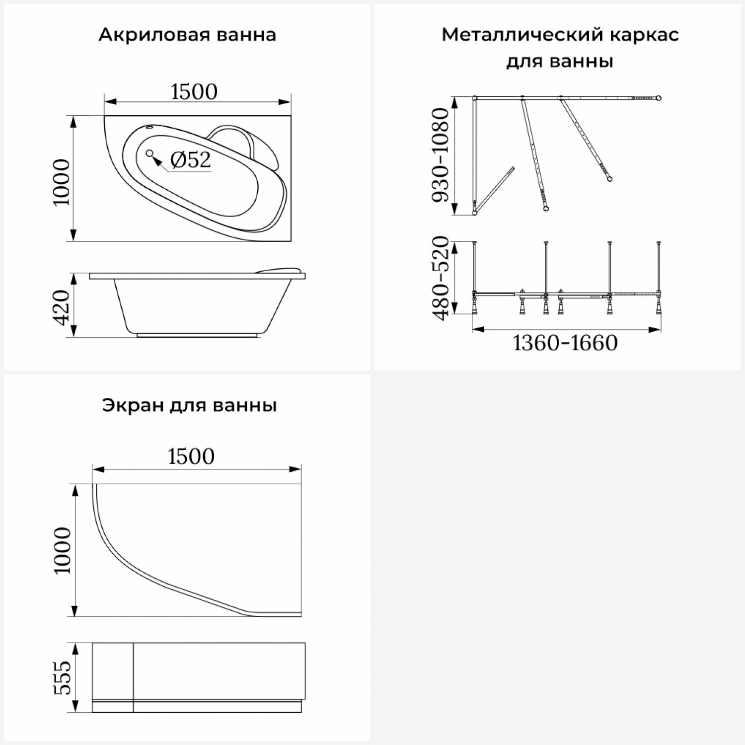 Акриловая ванна 150x70 с каркасом и экраном Lavinia Boho One S2-37010050 в наборе 3 в 1: прямоугольная ванна 150 x 70 см, каркас, экран