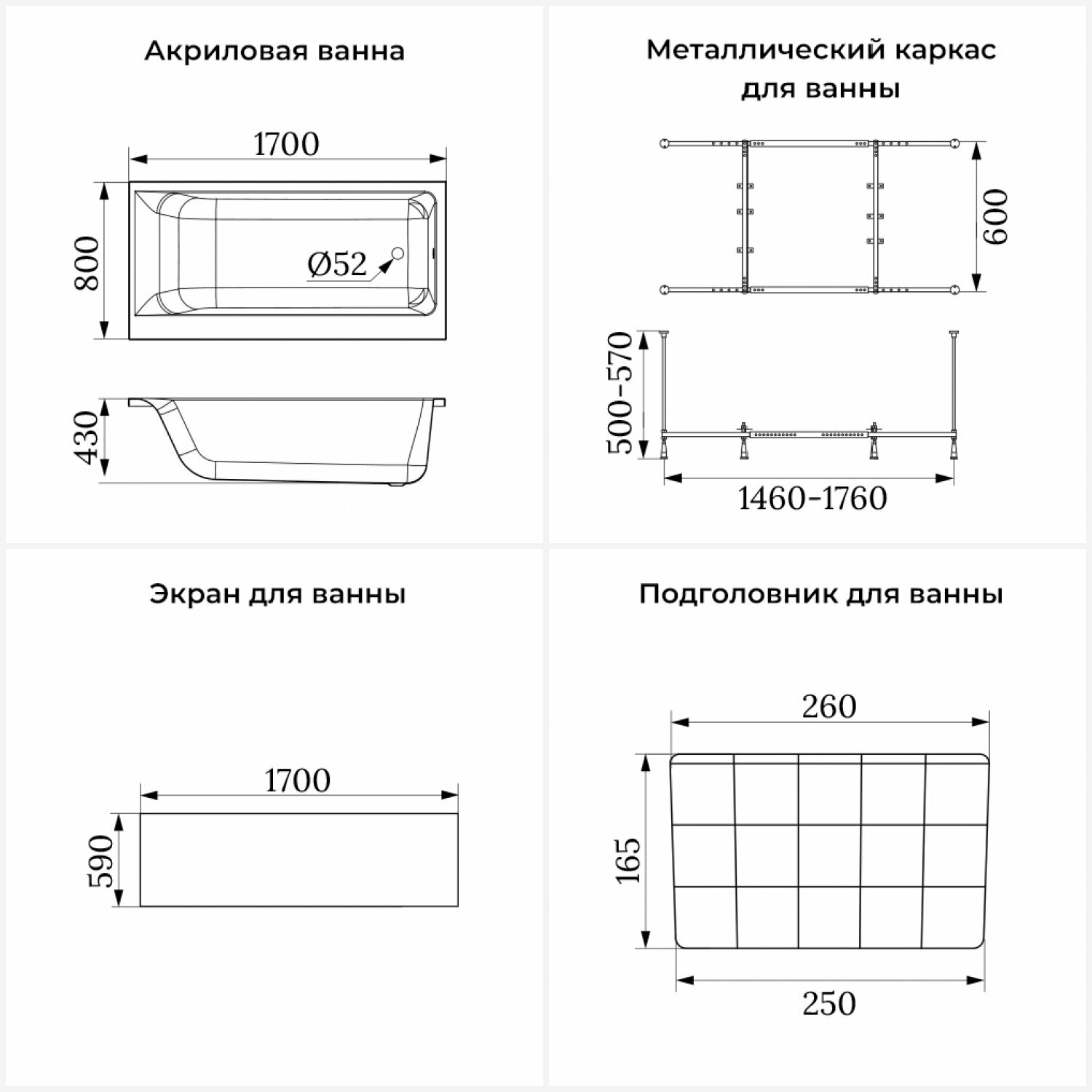 Акриловая ванна 170x75 с каркасом и экраном Lavinia Boho Pure S2-3710075P в наборе 4 в 1: прямоугольная ванна 170 x 75 см, каркас, экран, подголовник