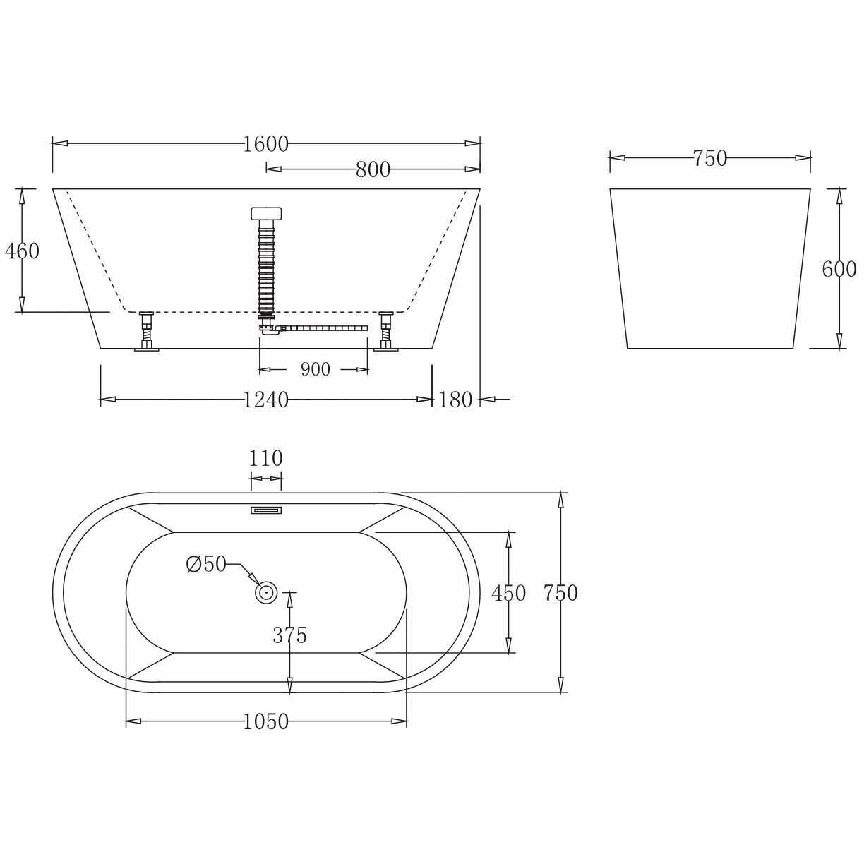 Акриловая ванна без перелива BELBAGNO BB71-1600-W0, 1600x750x600