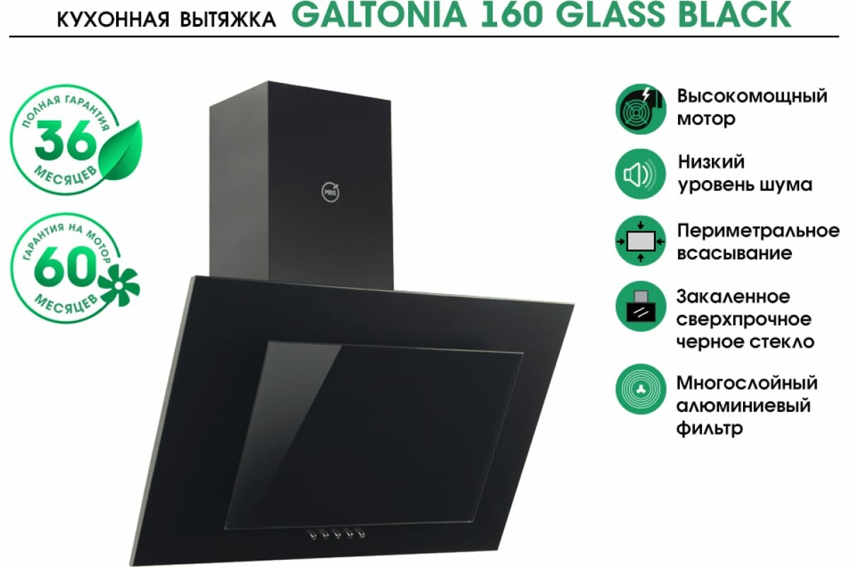 Купить Кухонная вытяжка наклонная MBS GALTONIA 160 GLASS BLACK/60 см/производительность 750м3/ч, низкий уровень шума.