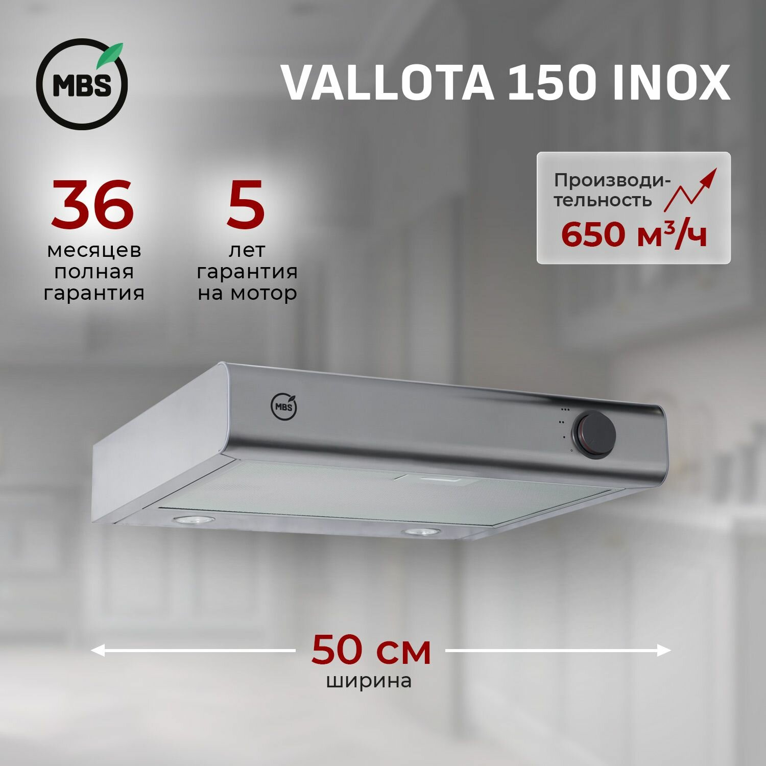 Кухонная вытяжка подвесная VALLOTA 150 INOX/50 см/производительность 650м3/ч, низкий уровень шума. интересное: