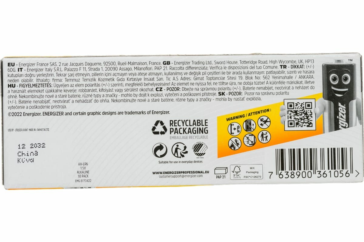 Батарейки Energizer Industrial, щелочные, AA, FR6, EN92, коробка, 10 штук