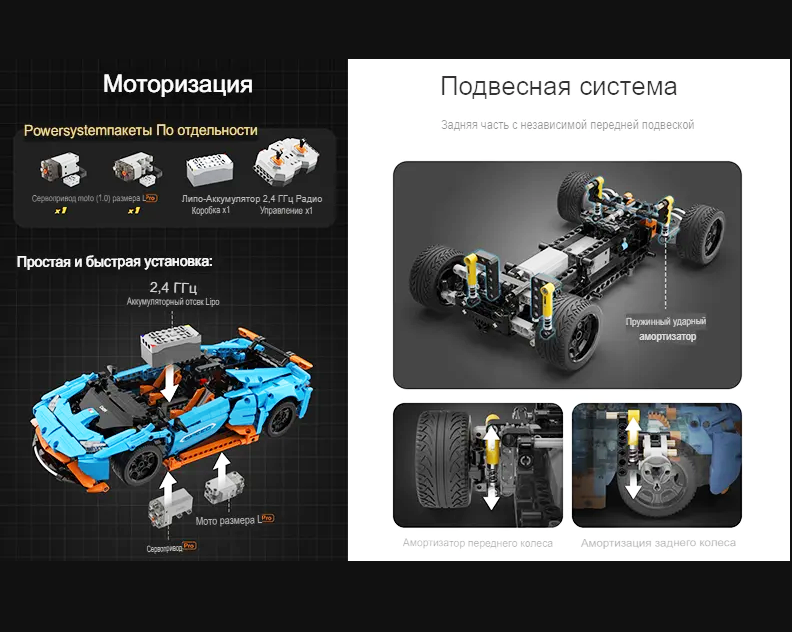 | Дополнительная информация | два режима дистанционного управления: программирование движения через мобильное устройство (с мобильным устройством машинка связывается по средствам Bluetooth), при помощи пульта управления 2,4 ГГц; подвижные элементы: двери, капот; датчики: гироскоп |
