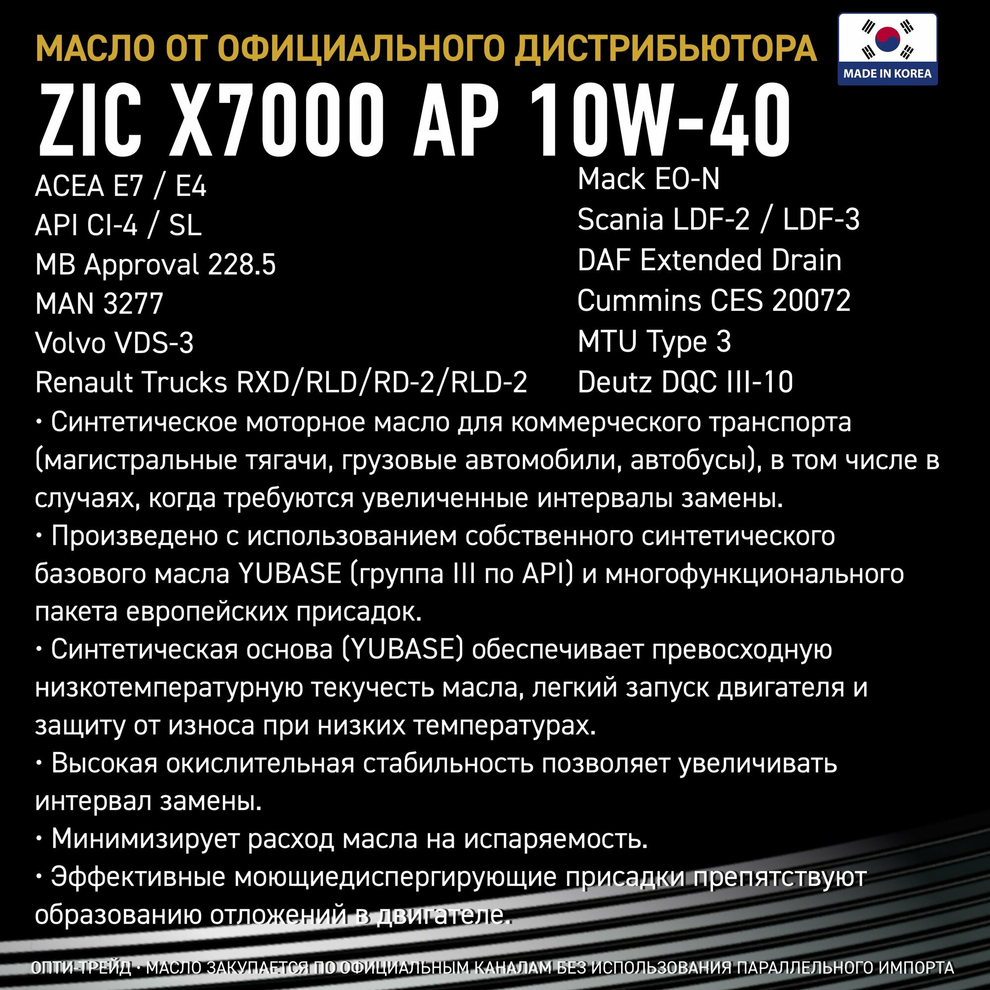 ZIC X7000 AP 10W40 (20L)_масло мот.! синт.\ACEA E7/E4, MB 228.5, Scania LDF-3, Volvo VDS-3