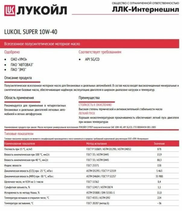 5/40 Супер Лукойл 60л. (48кг.) п/синт. API SG/CD Масло моторное LUKOIL 1773237 | цена за 1 шт