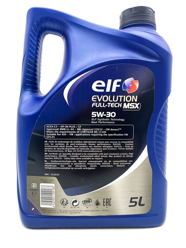 ELF 213932 Масло моторное синтетическое 5 л. ELF EVOLUTION FULL-TECH MSX 5W-30, ACEA C3, API SN, CF, VW 505 01, VW 502 00, MB 229.52, GM Dexos 2, BMW Longlife-04