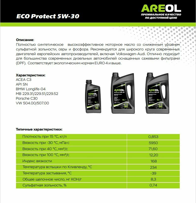 СохранитьAREOL Areol Eco Protect 5W30 (5L) Масло Моторное! Синт Acea C3, Api Sp, Vw 504.00/507.00, Mb 229.51 интересное: