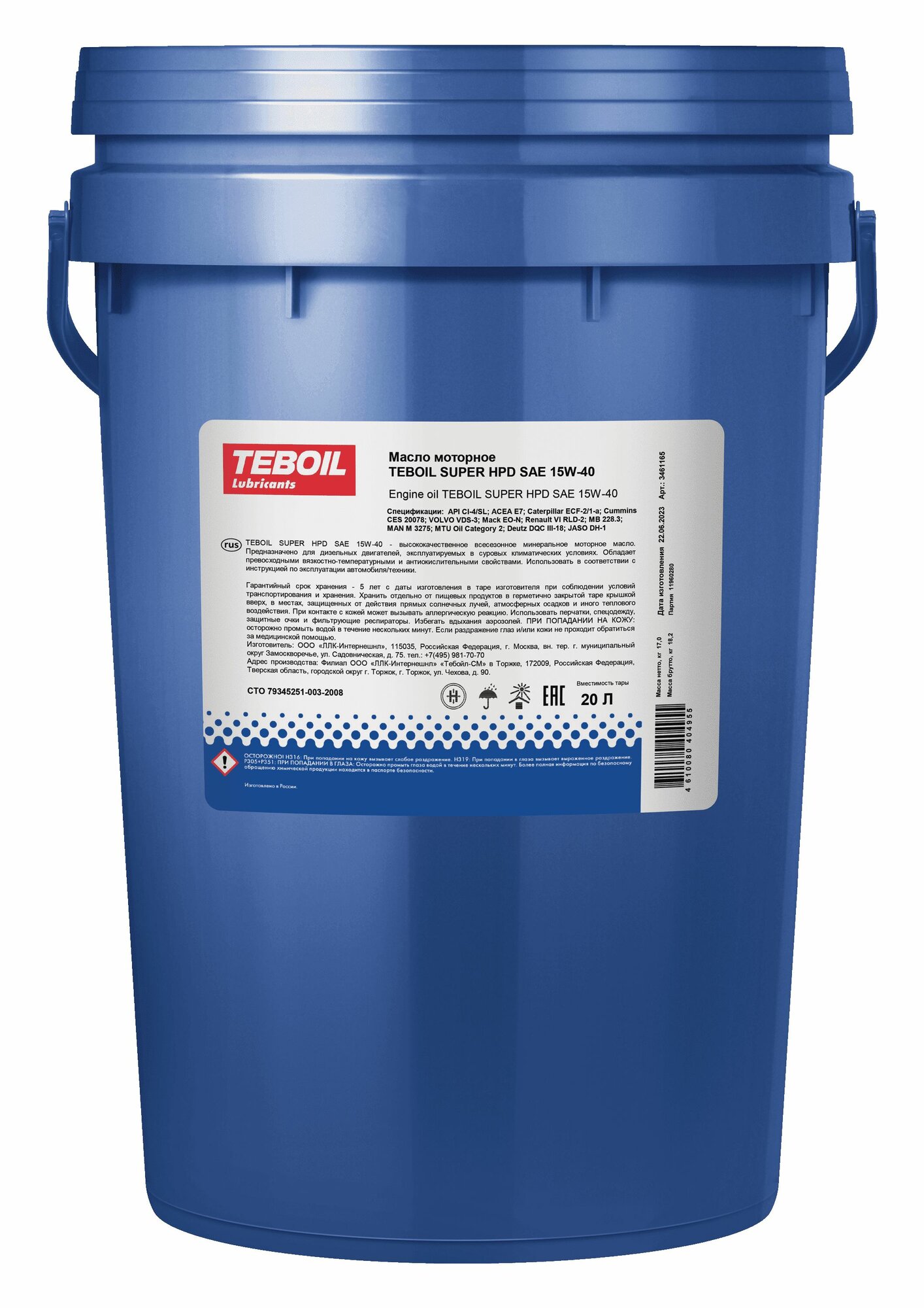 15/40 Super HPD TEBOIL 20л. (17кг.) мин. API CI-4/SL Масло моторное TEBOIL 3461165 | цена за 1 шт