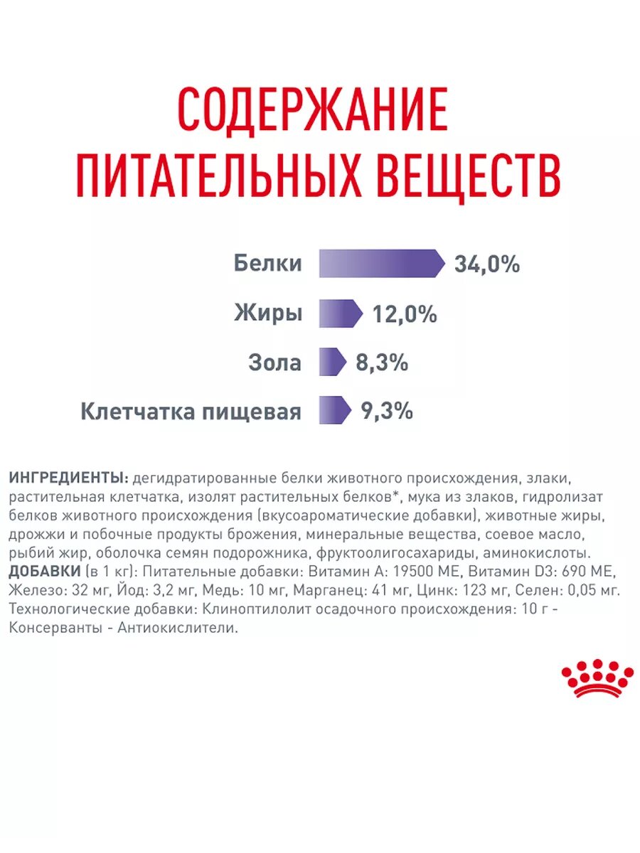 | Состав | дегидратированные белки животного происхождения (птица), злаки, растительная клетчатка, изолят растительных белков, мука из зерновых культур, гидролизат белков животного происхождения (вкусоароматические добавки), животные жиры, дрожжи и побочные продукты брожения, минеральные вещества, рисовый крахмал, соевое масло, рыбий жир, оболочка и семена подорожника, фруктоолигосахариды |