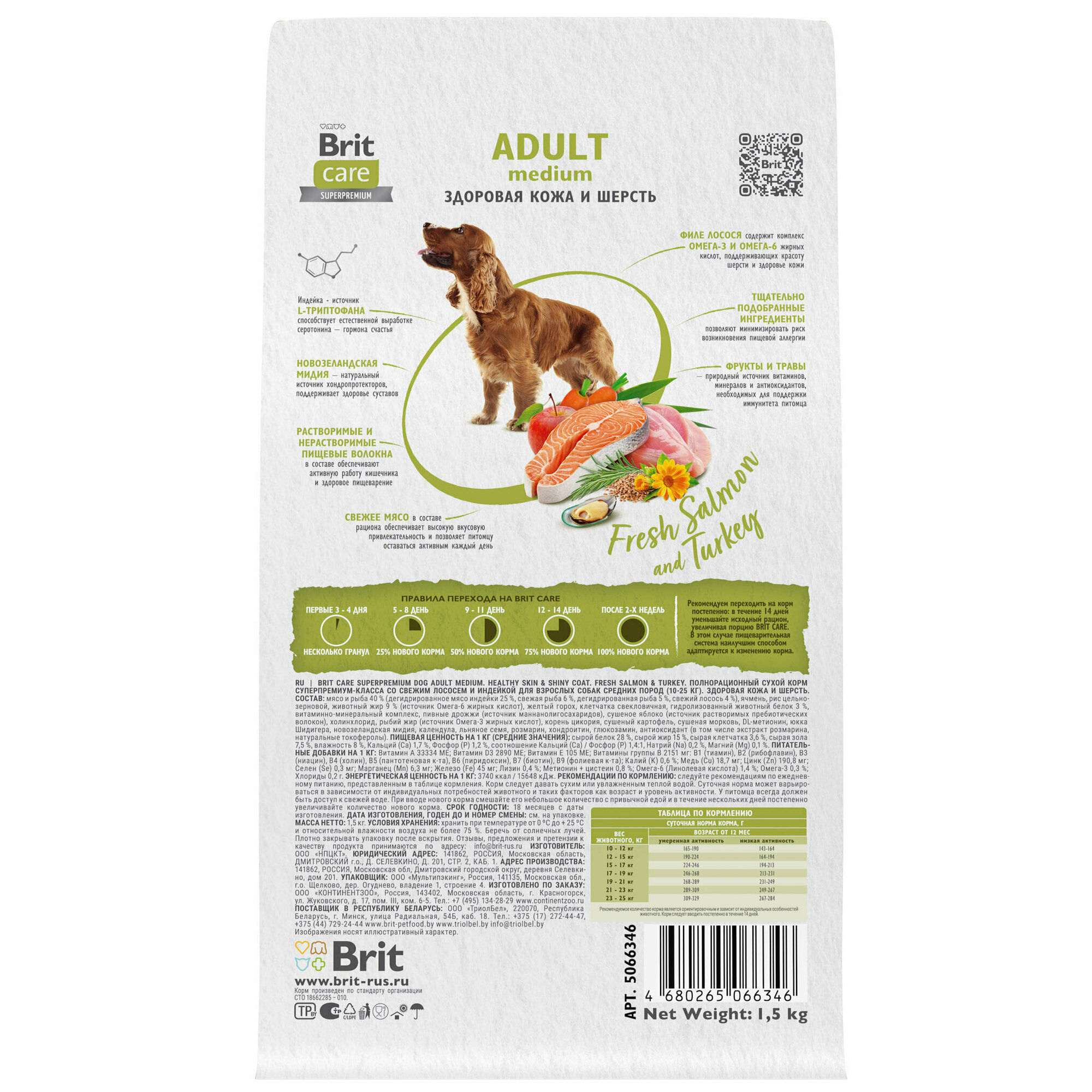 BRIT CARE, Сухой корм с лососем и индейкой для собак средних пород"Dog Adult M Healthy Skin&Shiny Coat",1.5кг