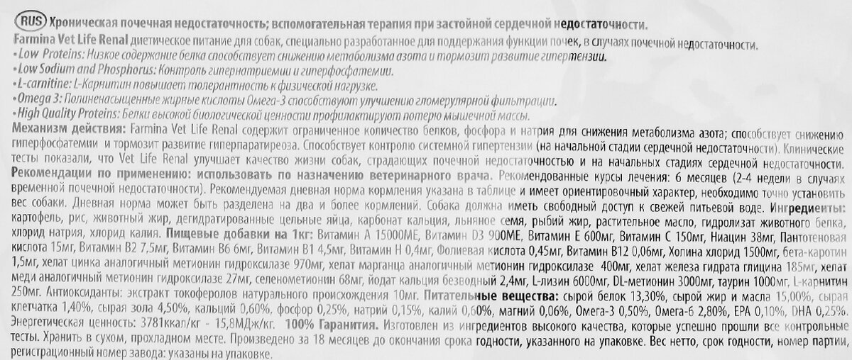 25241/5046 FARMINA Vet Life RENAL диета д/собак при заболеваниях почек 2кг