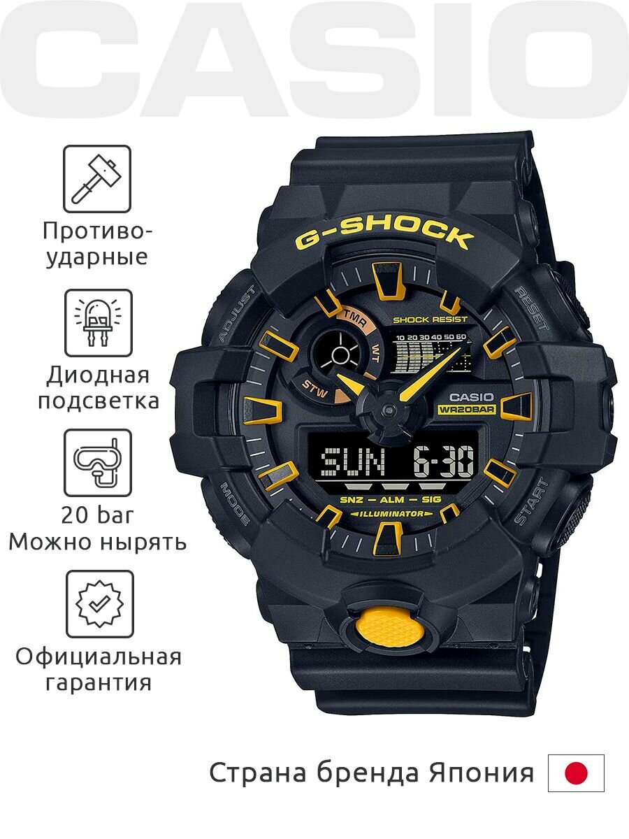 Наручные часы CASIO мужские GA-700-7A кварцевые, будильник, хронограф, секундомер, таймер обратного отсчета, водонепроницаемые, противоударные, подсветка дисплеябелый