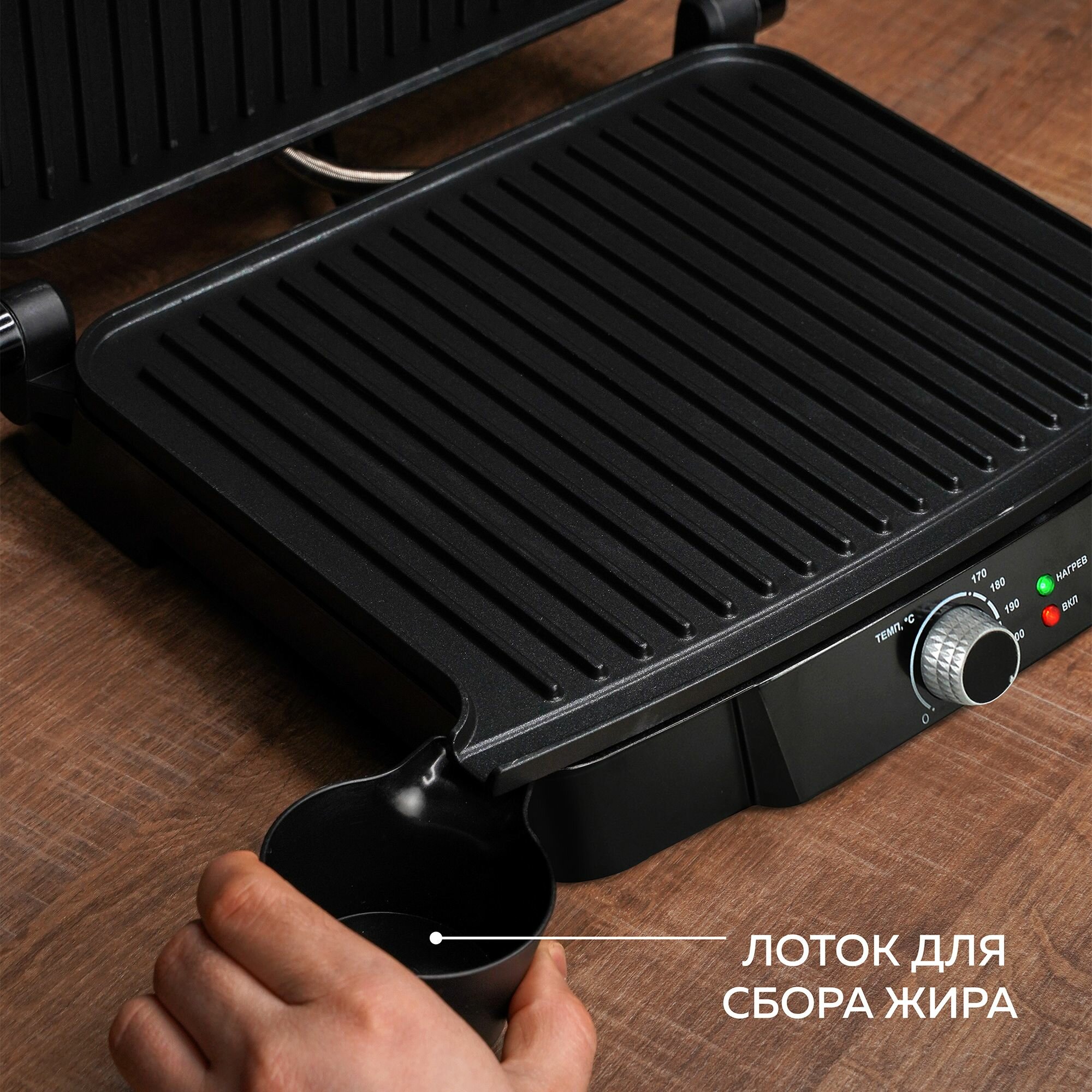 | Особенности | антипригарное покрытие / контактный гриль / поддон для сбора жира / регулировка высоты верхней панели |