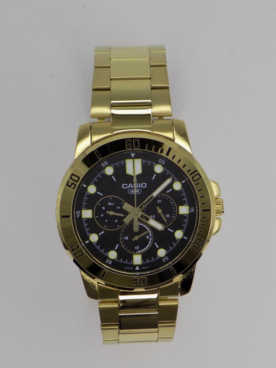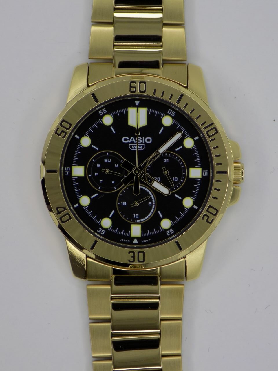 MTP-VD300G-1E Casio наручные часы кварцевые WR30 (3 атм) мужские золотой отображение числа, отображение дня недели подсветка стрелок минеральное стекло