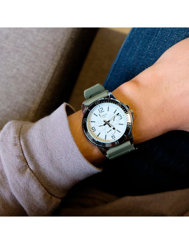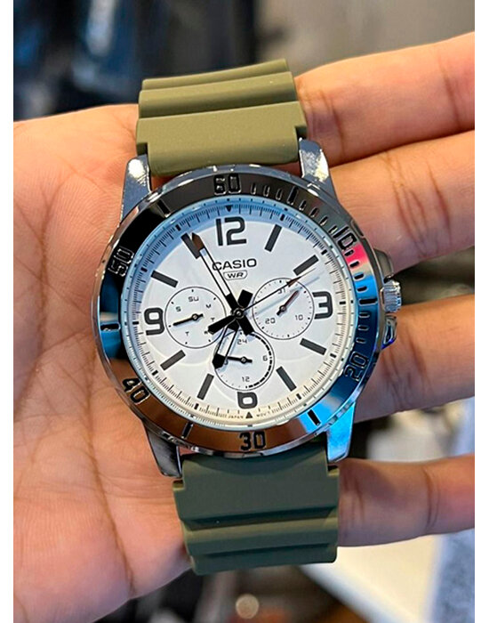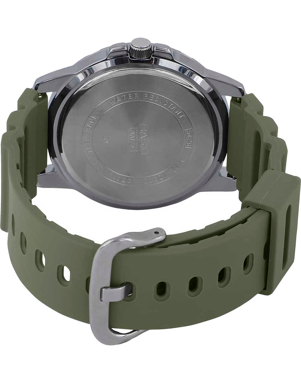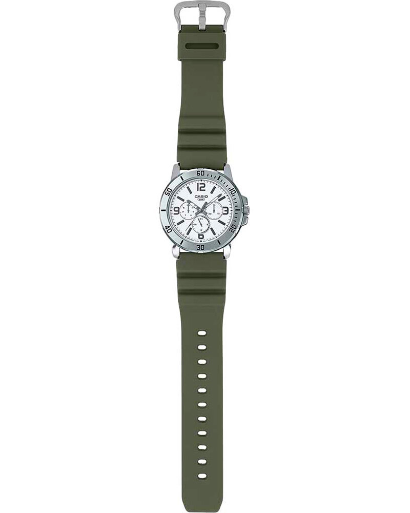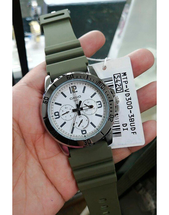MTP-VD300-3B Casio наручные часы кварцевые WR30 (3 атм) мужские хром, хаки отображение числа, отображение дня недели подсветка стрелок минеральное стекло