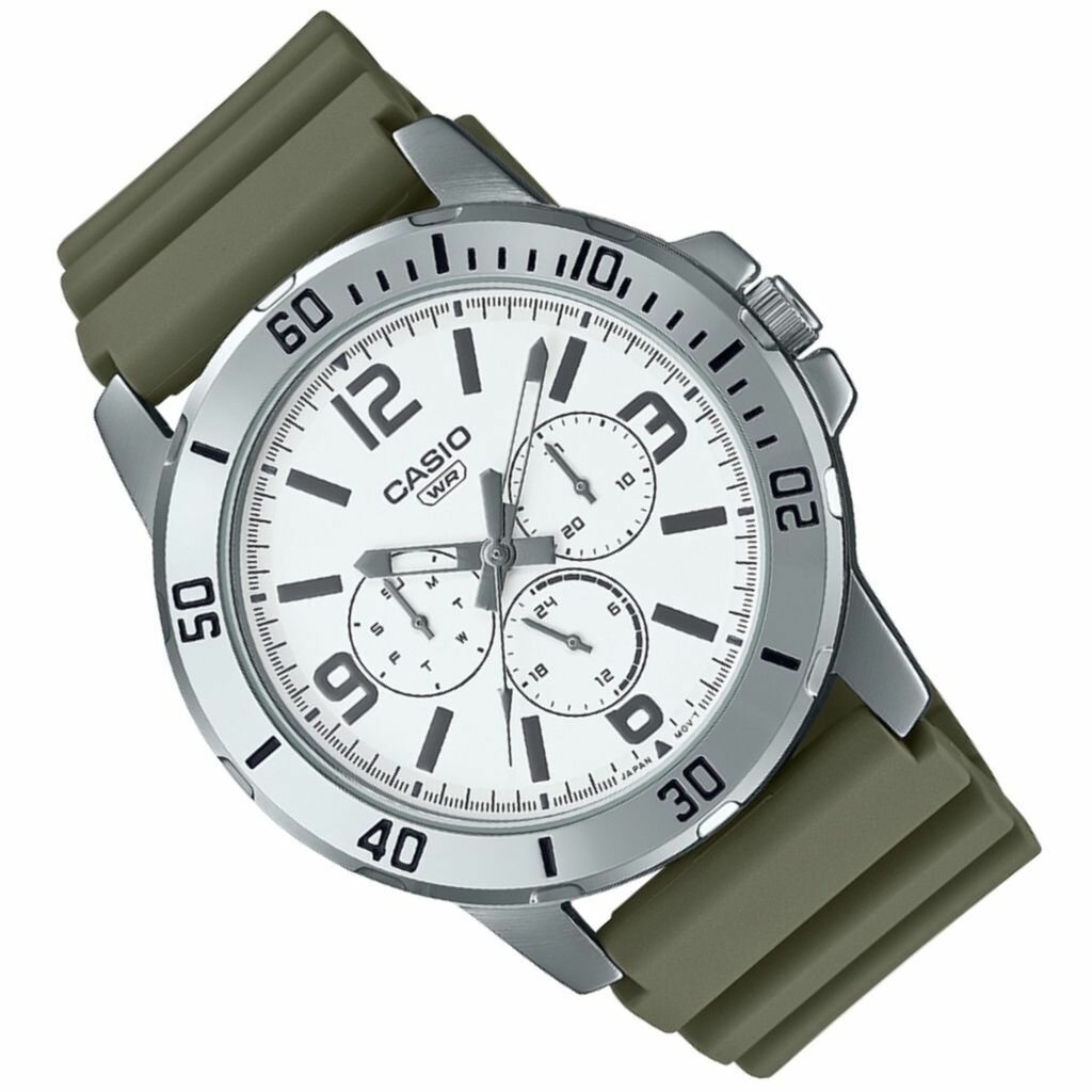 MTP-VD300-3B Casio наручные часы кварцевые WR30 (3 атм) мужские хром, хаки отображение числа, отображение дня недели подсветка стрелок минеральное стекло