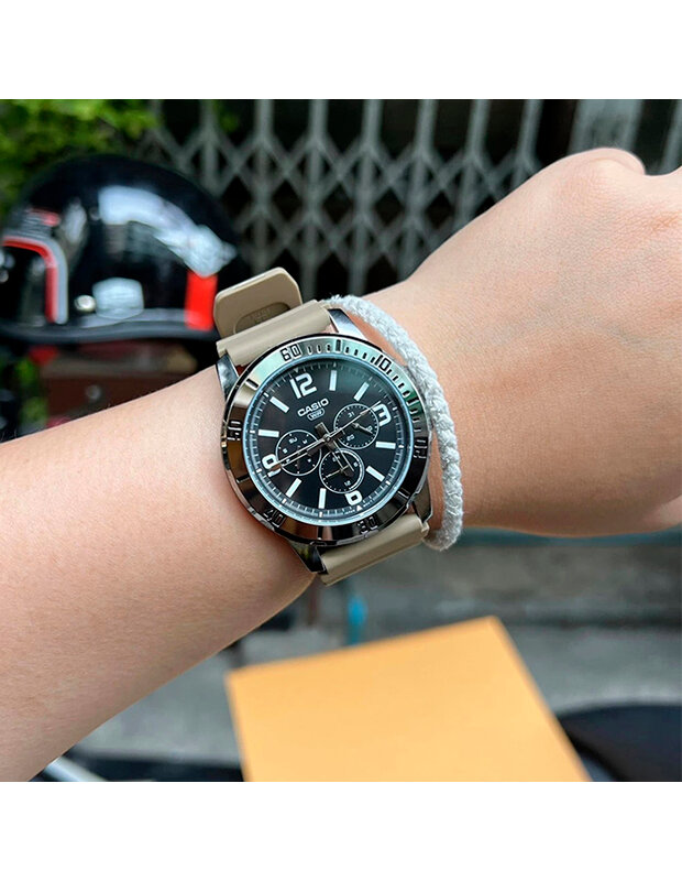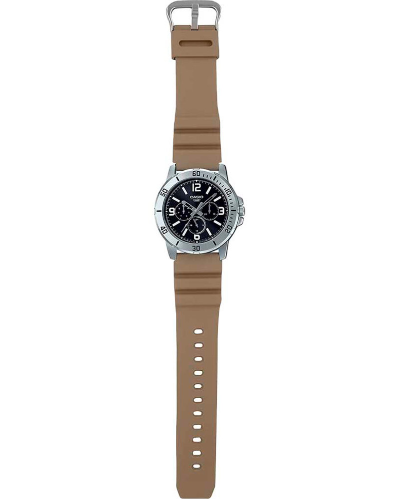 MTP-VD300-3B Casio наручные часы кварцевые WR30 (3 атм) мужские хром, хаки отображение числа, отображение дня недели подсветка стрелок минеральное стекло