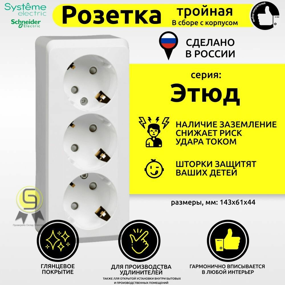 Розетка тройная Systeme (Schneider) Electric Этюд, накладная, с/з, белая