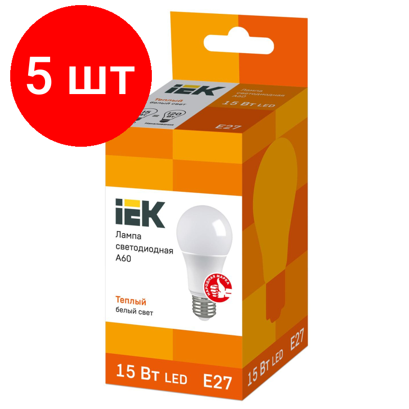 (5 шт.) Светодиодная лампочка IEK ЛОН A60 E27 15W(1350lm) 3000K 2K 116x60 ECO LLE-A60-15-230-30-E27 . Цоколь E27