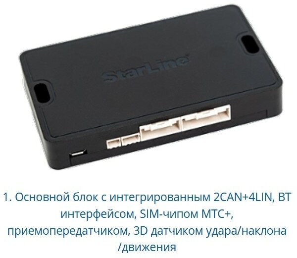 | Подробная комплектация | основной блок с интегрированным 2CAN+4LIN, BT интерфейсом, SIM-чипом МТС и SIM-холдером, приемопередатчиком, 3D датчиком удара/наклона/движения, брелок-метка (2 шт.), модуль запуска двигателя, датчик температуры двигателя, кнопка со светодиодом, предохранитель с держателем, реле 5-контактное с разъемом, сирена S-20.3, SIM-холдер (Теле2, Билайн, Мегафон), комплект проводов и монтажных материалов (может отличаться в зависимости от комплекса), комплект печатной продукции (может отличаться в зависимости от комплекса) |