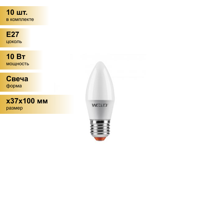 (10 шт.) Светодиодная лампочка Wolta лампа св/д свеча C37 E27 10W(900Lm) 3000K 2K 112X37 25YC10E27 . Цоколь E27