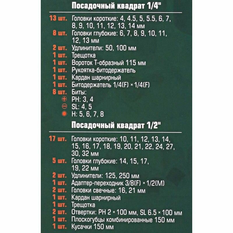 | Головки торцевые подробно | 1/2": 14, 15, 16, 17, 18, 19, 20, 22, 24, 27, 30, 32 мм; свечные 1/2": 16, 21 мм; 1/4": 4, 4.5, 5, 5.5, 6, 7, 8, 9, 10, 11, 12, 13, 14 мм; с битами 1/4": H3, H4, H5, H6, T8, T10, T15, T20, T25, T30, SL4, SL5.5, SL7, PH1, PH2, PZ1, PZ2; адаптер 3/8"(F)x1/2"(M); трещотка 1/2"; карданный шарнир 1/2"; удлинитель 1/2": 125, 250 мм; удлинитель 1/4": 50, 100 мм; гибкий удлинитель 1/4"; карданный шарнир 1/4"; трещотка 1/4"; держатель биты 1/2"x5/16" |