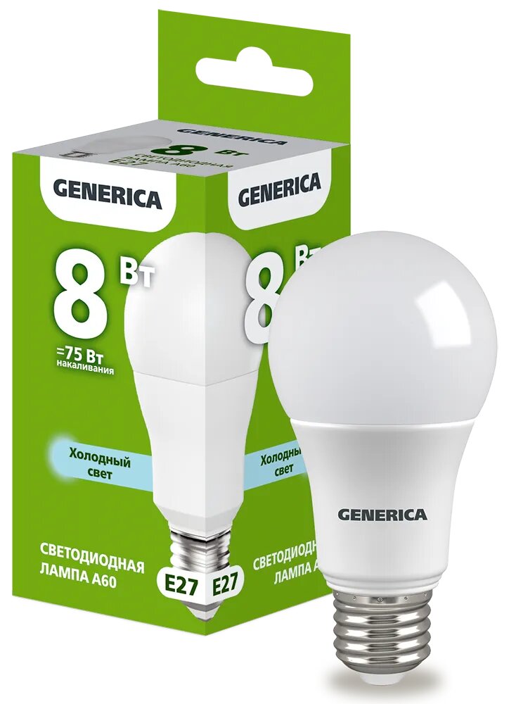Купить Лампочка светодиодная IEK GENERICA LED A60 груша 8Вт 230В 6500К E27 холодный белый свет(5 шт)