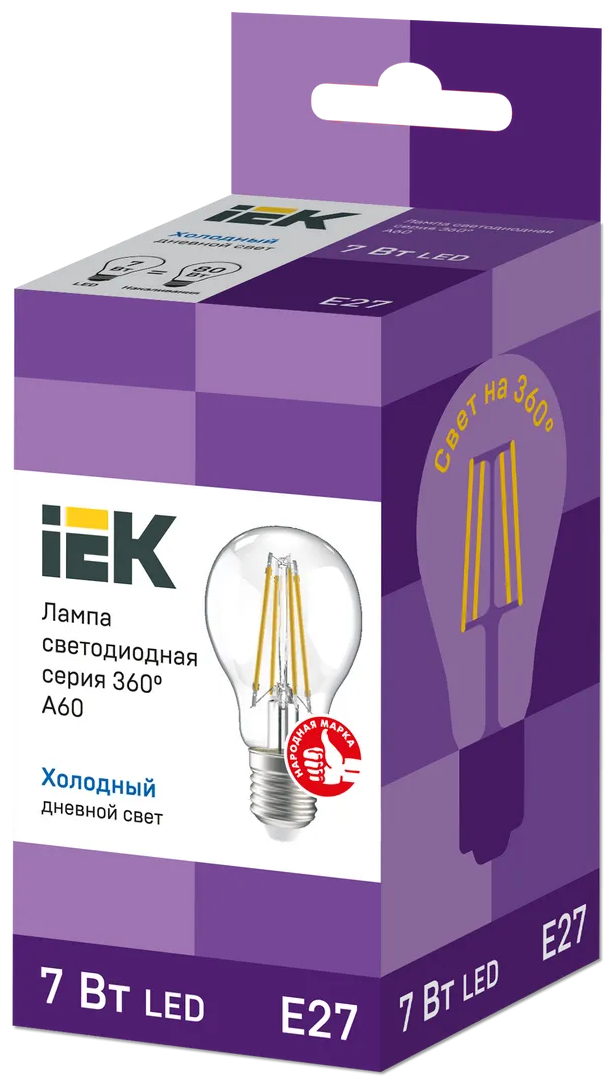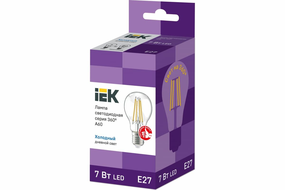 Лампа IEK серия 360, LED, A60, прозрачная, 7вт, 230В, 6500К, E27 LLF-A60-7-230-65-E27-CL