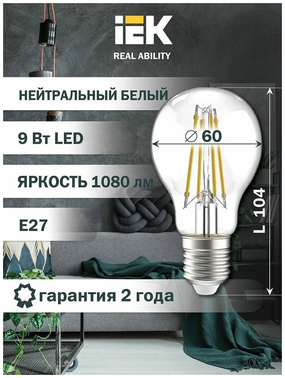 Светодиодная лампа IEK A60 9Вт 230В 4000К E27 филамент.
