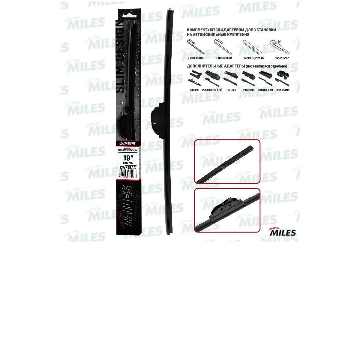 Щётка стеклоочистителя Miles CWF19AC бескаркас std 19"/480mm + color box + b3 adaptor hook 9x3/9x4 Miles CWF19AC
