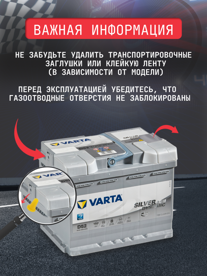 Аккумулятор автомобильный Varta Silver Dynamic AGM D52 6СТ-60 обр. 242x175x190